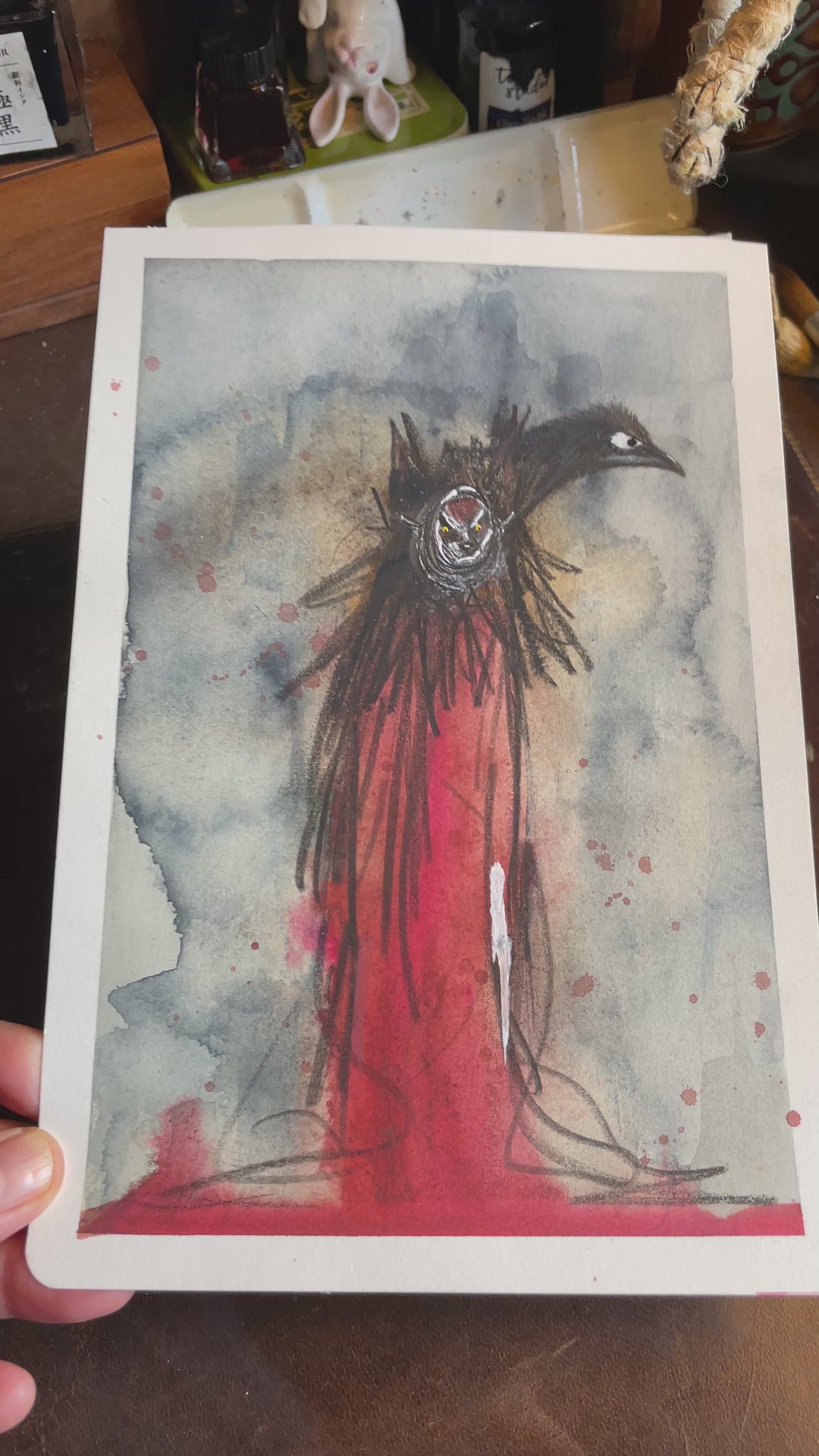 Artistic depiction of a creature with a bird-like head and humanoid body on a textured background.